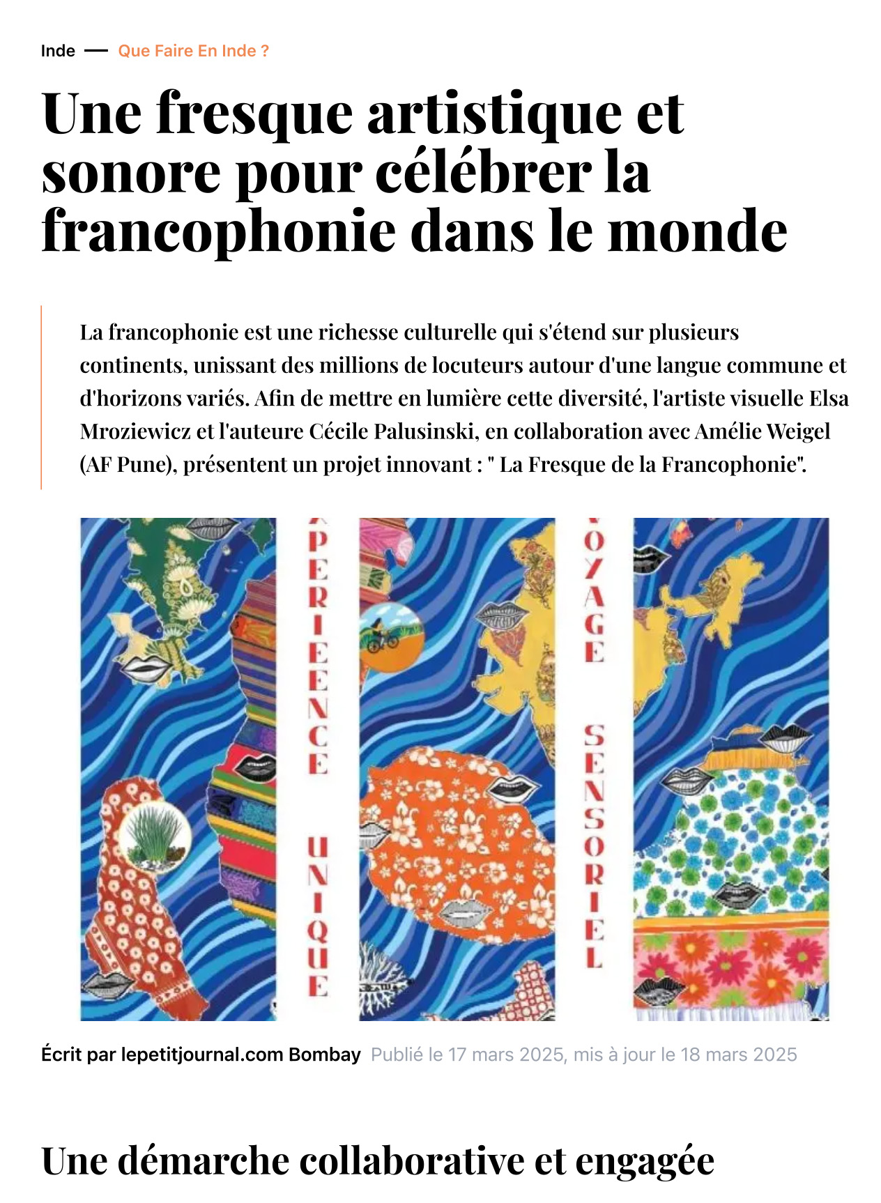 2025 : Fresque de la francophonie – Cartes poétiques : https://lepetitjournal.com/inde/a-voir-a-faire/une-fresque-artistique-et-sonore-pour-celebrer-la-francophonie-dans-le-monde-407818