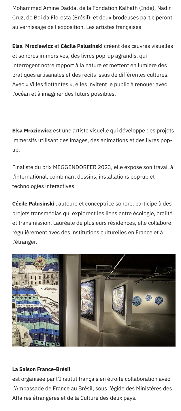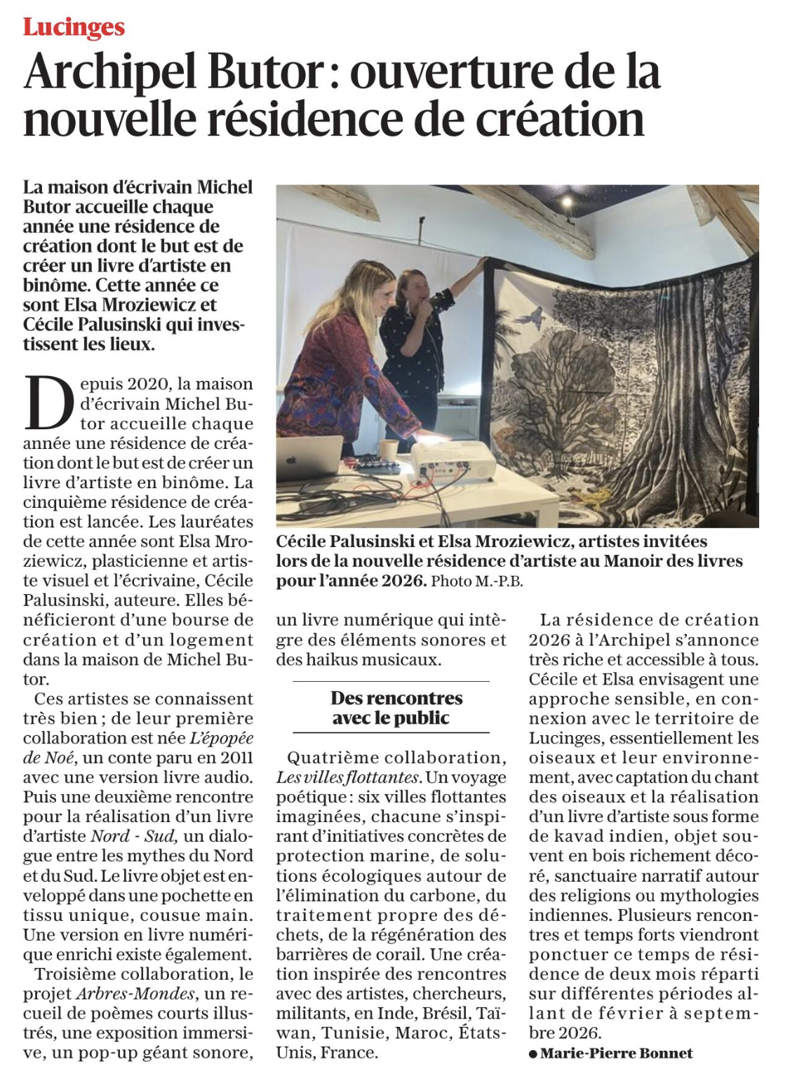 2026 : Résidence Archipel Butor – Livre d’artiste : https://www.archipel-butor.fr/cecile-palusinski-et-elsa-mroziewicz-laureats-de-la-residence-de-creation-2026/